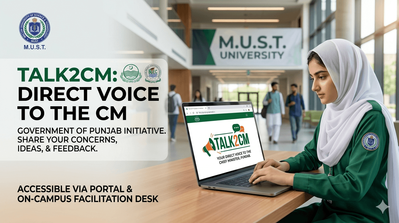 In line with recent directives from the Punjab Higher Education Commission (PHEC), MUST is pleased to announce the rollout of the "Talk2CM" initiative. Launched by the Government of Punjab, this platform provides a structured, transparent, and highly accessible communication channel between citizens and the Office of the Chief Minister.